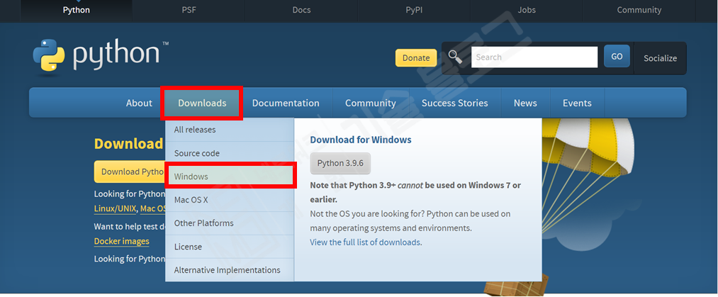 - 파이썬 공식 홈페이지의 메뉴바에서 "Downloads" -> "Windows" 선택