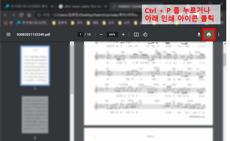 3) Ctrl + P 를 누르거나 오른쪽의 인쇄 아이콘 클릭하여 인쇄창 열기