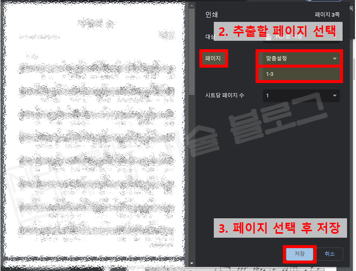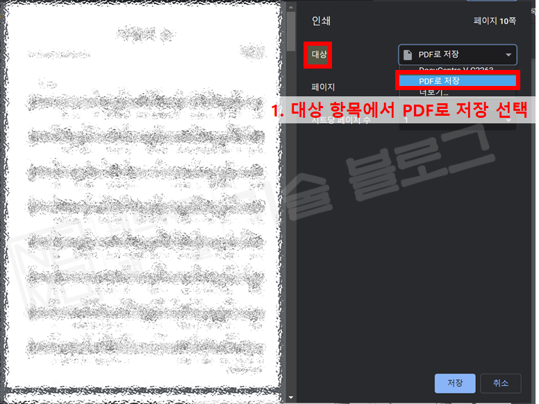 4) 인쇄 창에서 아래 항목 설정 후 저장하기