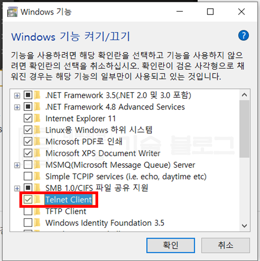 2) "Telnet Client" 혹은 한글로 "텔넷 클라이언트" 체크박스 활성화 후 확인 눌러줍니다.