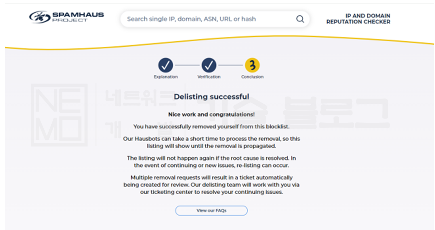 ** Delisting 작업은 근본적인 조치가 완료되지 않아도 바로 신청은 가능하나, 원인 조치가 되지 않으면 결국 다시 Blocklist에 오르게 됨. 임시 조치로 Delisting 작업은 진행한 후 추후에 원인 조치를 하는 것으로 작업 진행해도 무방하나 다시 Listing 되기 전에 조치 필요
