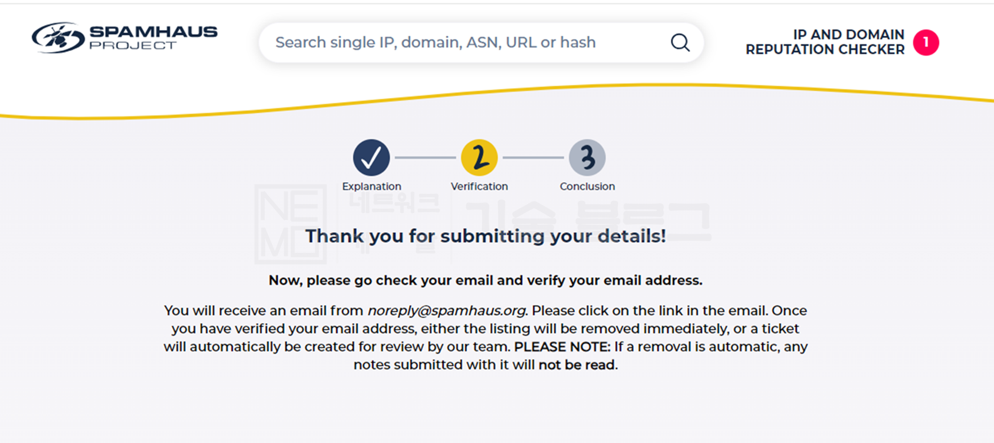 1) 아래 스팸하우스 Blocklist Removal Center 로 접속 후 차단 여부 확인