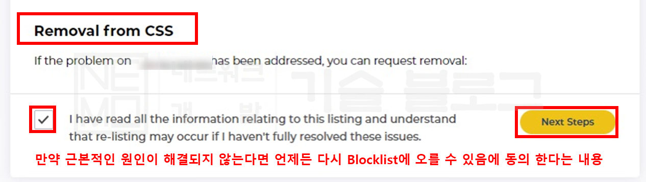 2) 원인이 모두 조치 되면 하단의 Removal from ~~ 항목에서 체크 박스 선택 후 "Next Steps" 선택